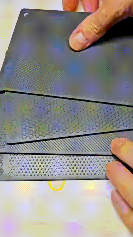 SketchTiles are physical texture stencils. Place a tile under your page, trace with any pencil or marker, and the pattern transfers onto your sketch. Each set includes four double-sided tiles with eight patterns.
